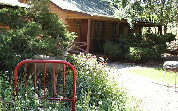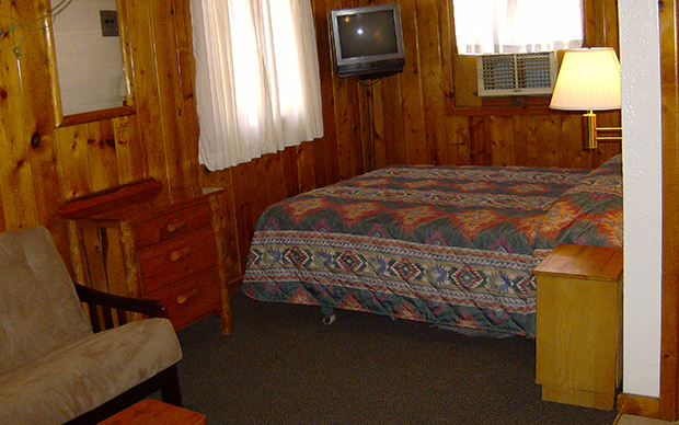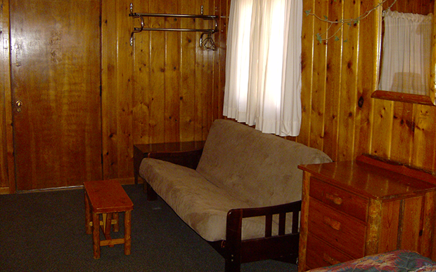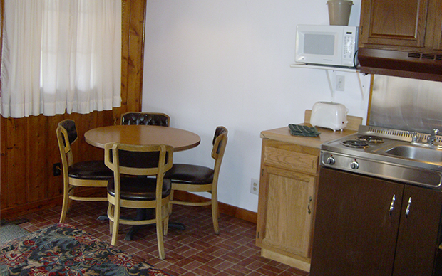 Cabins #30 & #31 are in the same building and share a covered porch. Each unit has one room with a queen bed and a futon on one side of the room and a dinette set and kitchenette area on the other side of the room. (The bed, futon, dinette set, and kitchenette are all in the same room). The fully stocked kitchenette has a two burner electric stove and a waist high fridge and a microwave oven (no regular oven). There is a bathroom with tub/shower.
