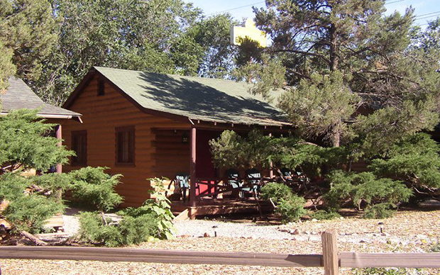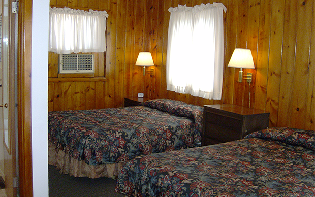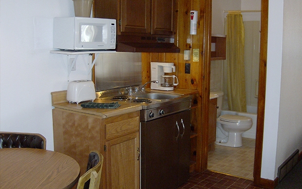 Cabins #32 & #33 are in the same building and share a covered porch. Cabins #34 & #35 are in the same building and share a covered porch. Each unit has one room with two double XL beds on one side of the room and a dinette set and kitchenette area on the other side of the room. (The beds, futon, dinette set, and kitchenette are all in the same room). The fully stocked kitchenette has a two burner electric stove and a waist high fridge and a microwave oven (no regular oven). There is a bathroom with a tub/shower.